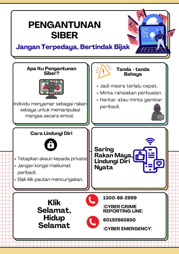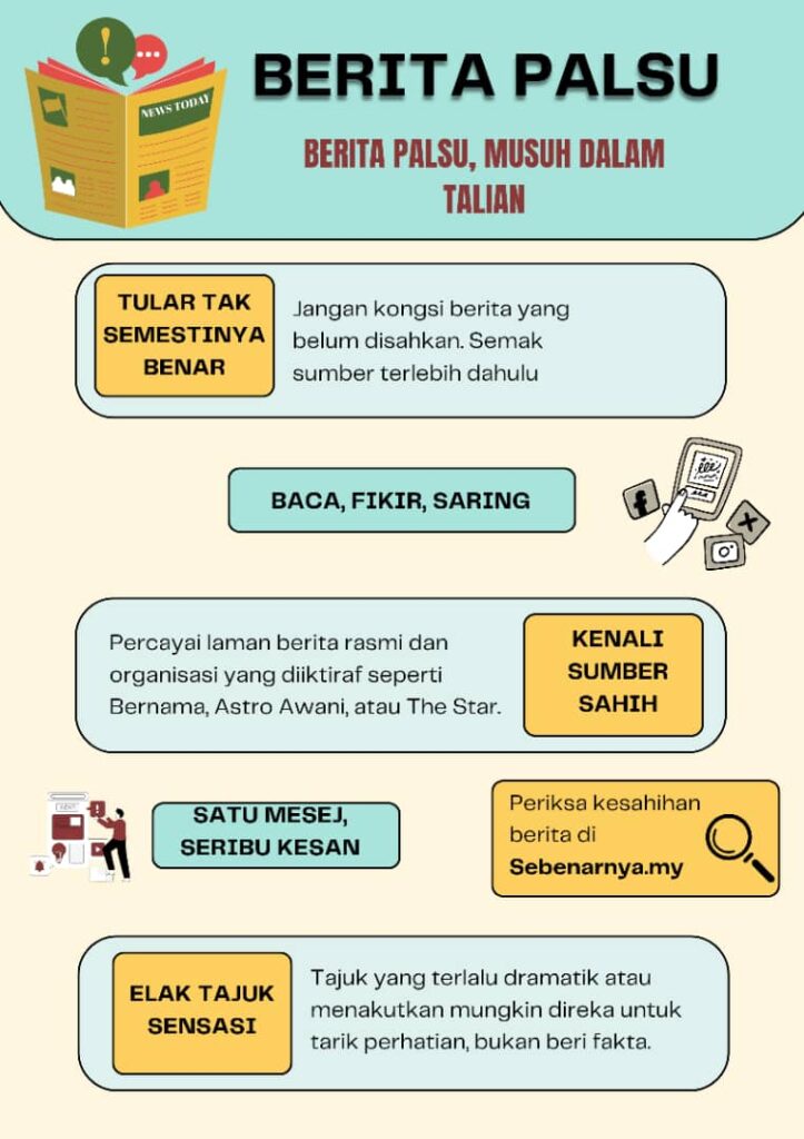 Utama > Featured/Pinned > Keselamatan Siber, Tanggungjawab Kita 💻🔒 18 September 2025 📰 Berita Palsu – Tular tidak semestinya benar. Semak sumber & sahkan di 👉 sebenarnya.my sebelum kongsi. 👤 Pengantunan Siber – Jangan mudah percaya orang asing di alam maya. Elak kongsi maklumat & gambar peribadi.