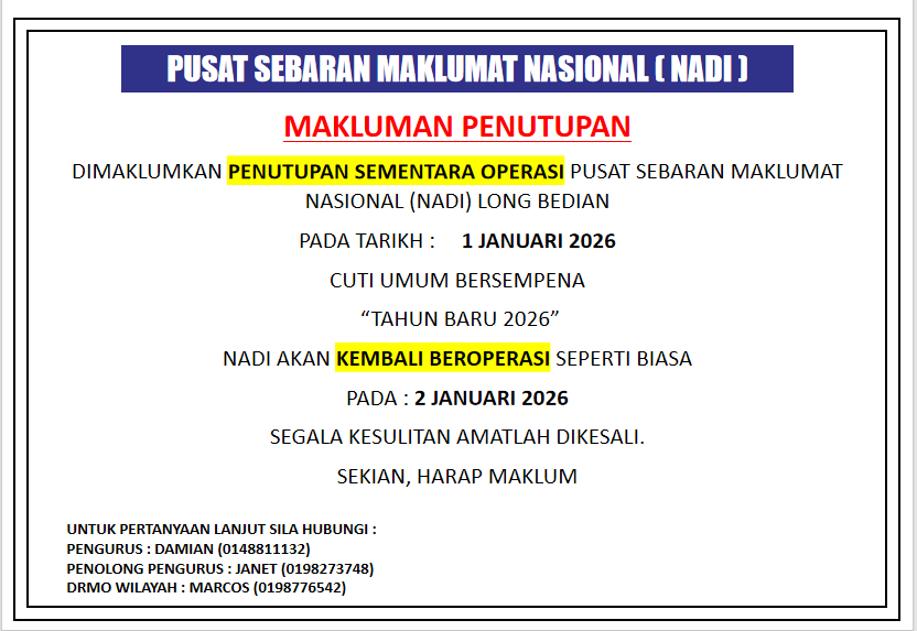 Notis Penutupan Sementara Operasi NADI Long Bedian